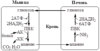 Мышцы выделяют особенно много аланина в силу их большой массы, активного потребления глюкозы при физической работе, а также потому, что часть энергии они получают за счёт распада АК. Образовавшийся аланин поступает в печень, где подвергается непрямому дезаминированию. Выделившийся аммиак идет на синтез мочевины, а ПВК включается в глюконеогенез. Глюкоза из печени поступает в ткани и там, в процессе гликолиза, опять окисляется до ПВК.