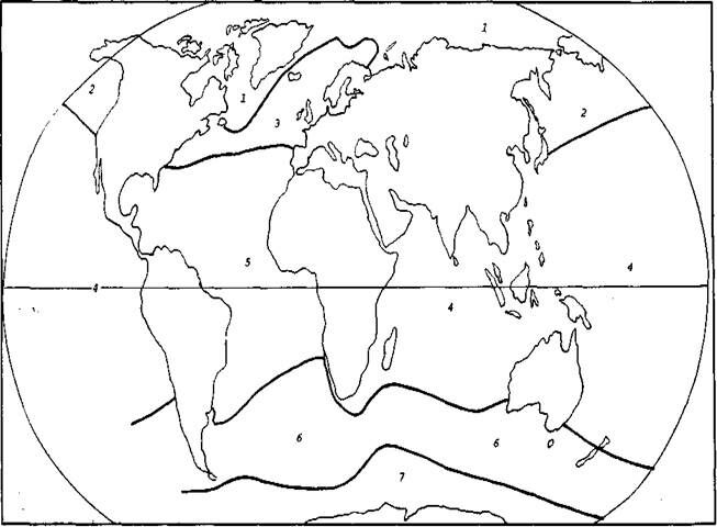 Области: 1–Арктическая, 2 – Бореаль-но-Тихоокеанская, 3 – Бореально-Атлантическая, 4 – Тропико-Индо-Тихоокеанская, 5 – Тропико-Атлантическая, 6 – Нотально-Антарктическая (Субантарктическая), 7 – Антарктическая.