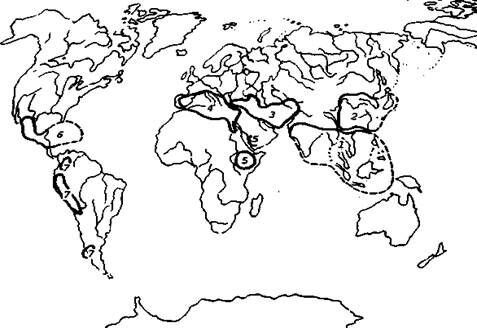 Н. И. Вавилов считал необходимым условием, кроме богатства дикорастущей флоры видами, пригодными для возделывания, наличие древней земледельческой цивилизации. Ученый пришел к выводу, что подавляющее большинство культурных растений связано 7 основными географическими центрами их происхождения: Южно-Азиатским тропическим, Восточно-Азиатским, Юго-Западноазиатским, Средиземноморским, Эфиопским, Центральноамериканским и Андийским (рис. 2).
