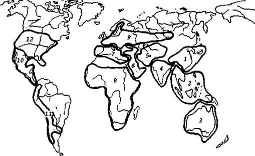 Рис 3. Центры происхождения культурных растений (по А.М.Жуковскому, 1974): 1 – Китайско-Японский; 2 – Индонезийско-Индокитайский; 3 – Австралийский; 4 – Индостанский; 5 — Среднеазиатский; б – Переднеазиатскнй; 7 – Средиземноморский; 8 – Африканский (а – Эфиопский); 9 – Европейско-Сибирский; 10 – Центральноамериканский; 11 – Южно-Американский; 12 – Северо-Американский.