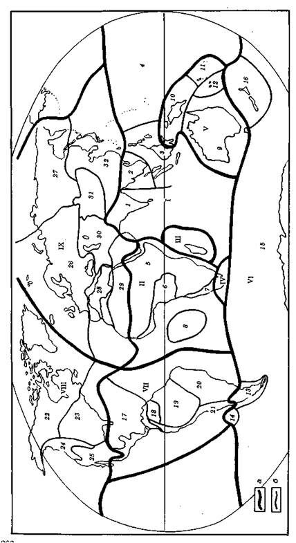 | Рис 6. Биотические регионы суши (по Второву, Дроздову, 1978): I – Ориентальное царство: области: 1– Индийская; 2 – Индокитайская; 3 –Малайская; 4– Тихоокеанская. П–Эфиопское царство: области: 5 – Суданская; 5–Конголезская; 7–Калахари-Намибская; 8 – Атлантическая; III – Мадагаскарское царство. IV – Капское царство. V – Австралийское царство: области: 9 – Материковая; 10 – Новогвинейская; 11–Фиджийская; 12 – Новокаледонская. "15. Регистрация документов" - тут тоже много полезного для Вас. VI –Антарктическое царство: области: 13 – Магелланова; 14 – Хуан-Фернандесская; 15 — Циркумполярная; 16 — Новозеландская. VII – Неотропическое царство: области: 17– Карибская; 18 – Гвианская; 19 – Амазонская; 20 – Южно-Бразильская; 21– Андийская. VП1 – Неарктическое царство: области: 22 – Канадская; 23 – Миссисипская; 24 – Кордильерская; 25 – Сонорская. IX – Палеарктическое царство: области: 26 – Европейская; 27 – Ангарская; 28 – Средиземноморская; 29 – Сахаро-Синдская; 30 – Ирано-Туранская; 31 – Центральноазиатская; 32 – Восточно-Азиатская. а — границы царств; б - границы областей.