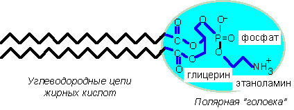 Примером амфифильной молекулы может служить молекула фосфатидилэтаноламина, структура которой показана на рис. 2. Как и другие фосфолипиды, фосфатидилэтаноламин, в химическом отношении представляет собой сложные эфиры трехатомного спирта глицерина с двумя жирными кислотами; к третьей гидроксильной группе присоединен ортофосфат, а к нему - небольшая органическая молекула, характерная для каждого вида фосфолипидов. В рассматриваемом случае это этаноламин, но могут быть также холин, инозитол, серин и некоторые другие молекулы.
