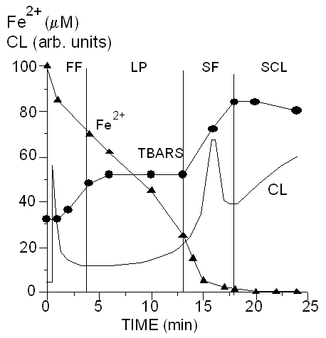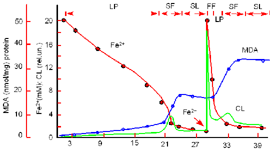 Это происходит потому, что ионы двухвалентного железа вступают в реакцию с продуктом перекисного окисления - гидроперекисями липидов: