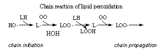 В реакцию продолжения цепи вовлекаются всё новые и новые молекулы субстратов, т.е. молекулярный кислород О2 и полиненасыщенные жирные кислоты LH, и в каждом звене этой цепной реакции образуется молекула продукта - гидроперекиси липида LOOH