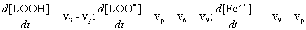 2. Подставляем в правые чсти уравнений начальные значения [LOOH], [LOO·] и [Fe2+].