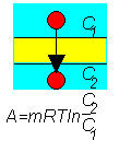| Рис. 6. Осмотическая работа по переносу ионов (или нейтральных молекул) через мембрану. С1 и С2 - концентрации в водных растворах, разделяемых мембраной. |