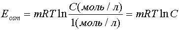 Всякая энергия исчисляется по отношению к энергии некоторой другой системы, принятой за стандарт. В нашем случае за стандарт принимают осмотическую энергию 1 молярного раствора. Таким образом находим осмотическую энергию ионов (молекул) в растворе с концентрацией C: