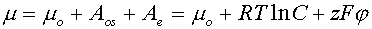 3. Поместить один моль ионов в поле с потенциалом, существующим в данном растворе (или вообще в данной среде, если речь идёт, например о мембране). Работа, которая при этом будет затрачена, равна, как показывает уравнение 12, , поскольку исходный потенциал (там откуда мы мысленно переносим ион) принимается равным нулю. Общая работа, затраченная на создание такого раствора, будет равна сумме химической, осмотической (концентрационной) и электрической составляющих: