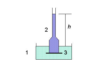 | Рис. 3. Опыт, доказывающий существование осмотического давления. В сосуд 1 с растворителем (например, чистой водой) опущена трубка 2, закрытая снизу полупроницаемой мембраной 3. В трубку налит раствор вещества, для которого мембрана непроницаема. Создаётся давление (h-высота столба жидкости). |