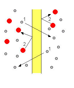 | Рис. 4. Давление, оказываемое на полупроницаемую мембрану молекулами растворителя (маленькие серые кружочки) и растворённого вещества. Молекулы растворителя свободно проходят сквозь мембрану и давления на неё не оказывают (1). Молекулы растворённого вещества не проходят сквозь мембрану и оказывают давление на неё, равное давлению газа на стенку. |