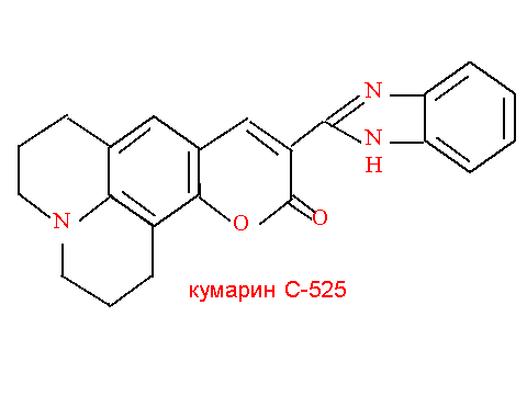 Так например, комплекс редкоземельного иона европия (Eu3+) c антибиотиком хлор-тетрациклином усиливает ХЛ при окислении липидов почти в 1000 раз. Один из красителей, производное кумарина, применяемое при создании лазеров под условным названием С-525, усиливает хемилюминесценцию, сопровождающую цепное окисление липидов, более, чем в 1500 раз, никак не влияя при этом на ХЛ при взаимодействии радикалов кислорода (гидроксила и супероксида). Формула этого вещества приведена ниже.
