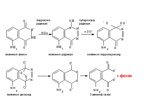 Чистая перекись водорода с люминолом реагирует вяло, и хемилюминесценция при этом не наблюдается. Если перекись водорода разлагается ферментативным путем, например, при действии каталазы, свободные радикалы не образуются и hemilum также не возникает. В присутствии ионов металлов переменной валентности, таких как железо, медь или марганец, а также некоторых их комплексов, например, производных гема, перекись водорода разлагается с образованием радикалов (гидроксила и супероксида) и возникает яркое hemilum, связанное с реакциями люминола (см. Рис. 1).