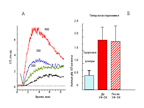 Как видно на рис. 2 (Б) у больных семейной гиперхолестеринемией (при этой наследственной болезни в крови содержится очень много холестерина и имеется выраженная предрасположенность к раннему развитию атеросклероза) ХЛ ответ клеток на стимул почти в четыре раза превышает ответ клеток здоровых доноров. Назначенное лечение - облучение крови ультрафиолетовым светом (УФ-ОК) оказалось малоэффективным, если верить данному показателю.