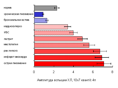 | Рис. 3. Амплитуда ХЛ-ответов изолированных лейкоцитов крови, полученной от больных различными заболеваниями [5].Стимулирование клеток осуществляли частичками латекса. |