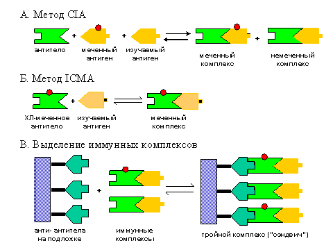 В обоих методах одна из практических трудностей - это очистка иммунных комплексов. Она решается также методами иммунохимии. Детали этой техники мы здесь рассматривать не будем, но один из подходов заключается, например, в использовании порошка сорбента (см. Рис. 6 В), к поверхности которого "пришиты" (т. е. присоединены ковалентной химической связью) антитела к анти-А (назовем их анти-анти-А). В присутствии растворенных комплексов (А-анти-А и/или А*-анти-А) образуется тройной комплекс ("сандвич"): (анти-анти-А)-(анти-А)-А и/или (анти-анти-А)-(анти-А)-А*. Адсорбент можно осадить и затем определить в осадке (после дополнительных обработок) количество меченного антигена.