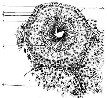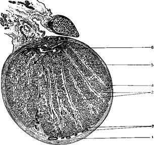 1 – белочная облочка; 2 – сосудистая оболочка; 3 – дольки семенника; 4 – извитыесеменные канальцы; 5 – перегородки семенника; 6 – сеть семенника.