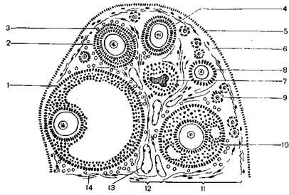 1 – граафов пузырек; 2 – многослойный фолликул; 3 – клетки Лейдига; 4 – двуслойных фолликул; 5 – эпителий; 6 – белочная оболочка; 7 – погибшая яйцеклетка; 8 – однослойный фолликул; 9 – первичный фолликул; 10 – граафов пузырек; 11 – корковый слой яичника; 12 – мозговой слой яичника; 13 – кровеносные сосуды; 14 – прослойки соединительной ткани.