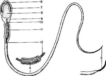 1 – головка; 2–- шейка; 3 – средняя часть; 4 – главный отдел хвостика; 5 – конечный отдел хвостика; 6 – локализация гиалуронидазы; 7 – акросома; 8 – ядро, 9 – проксимальная центриоль; 10 – дистальная центриоль; 11 – митохондриальная спираль, 12 – микротрубочки.