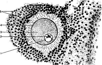 1 – ядро; 2 –ядрышко; 3 – цитоплазма; 4 – первичная оболочка; 5 – вторичная оболочка.
