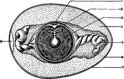 / – зародышевый диск (дискобластула); 2 – желточная (первичная) оболочка; 3 – желток; 4 – белок (третичная оболочка); 5 – халазы; 6 – подскорлуповая (третичная) оболочка; 7 – скорлуповая (третичная) оболочка; 8 – воздушная камера.