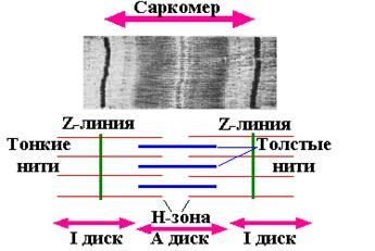 При рассмотрении миофибриллы под электронным микроскопом видны темные и светлые полосы или диски (А и I диски). Центральная зона А диска (H зона) при этом кажется менее оптически плотной, чем остальная его часть. I участок (или I диск) как бы делится на две части очень плотной и узкой Z-линией. Также видны два типа вытянутых нитей. Один тип — это толстая нить, соответствующая А диску. Второй тип — тонкая нить, расположена в