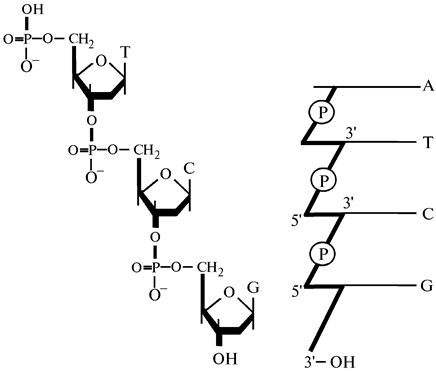 Соседние нуклеотиды связаны друг с другом посредством сложноэфирной связи между пентозой одного и фосфатной группой другого нуклеотида. Азотистые основания не участвуют в образовании никаких других ковалентных связей, кроме тех, которые связывают их с остатками моносахаридов сахарфосфатной цепи.