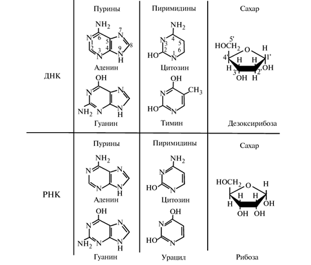Рис. 2. Структурные компоненты нуклеиновых кислот: азотистые