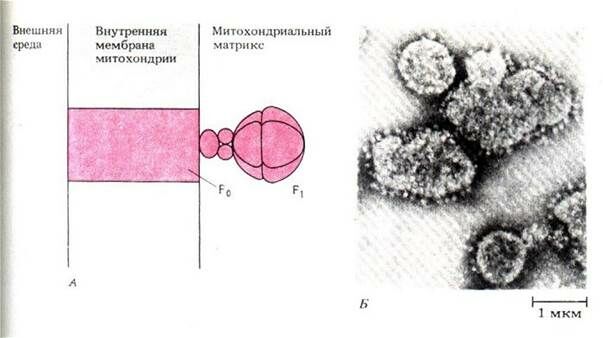 (справа показана электронная микрофотография пузырьков, полученных из внутренней митохондриальной мембраны, на которой видны выступающие во внутреннее пространство части АТФ-синтетазы)