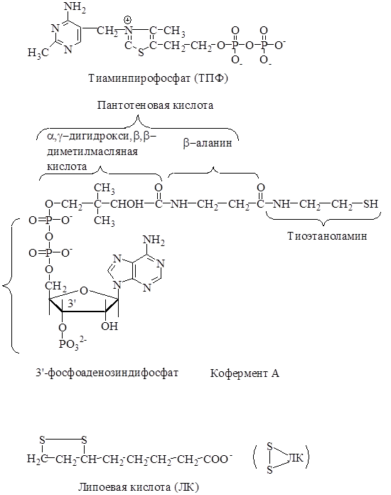 В состав пируватдегидрогеназного комплекса входит 3 фермента и 5 кофакторов. I-й фермент – пируватдегидрогеназа содержит кофактор тиаминпирофосфат (производное витамина В1); II-й фермент – дигидролипоилтрансацетилаза содержит кофакторы липоевую кислоту (ЛК, 6,8-дитиооктановая кислота) и кофермент А (НS-КоА), причем остаток липоевой кислоты присоединен к апоферменту путем образования амидной связи между карбоксильной группой ЛК и ε-аминогруппой лизина белка (образуется длинная «рука», состоящая из 13 атомов углерода); III-й фермент - дигидролипоилдегидрогеназа содержит кофакторы ФАД и НАД+.