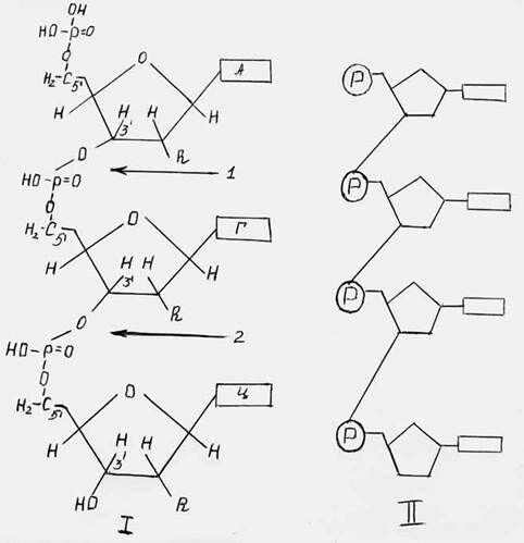 Рис. 3.1 Строение фрагмента нуклеиновой кислотыI - полусхематическая и II - схематическая форма записи; 1 и 2 - фосфодиэфирная связь; А, Г, Ц, - азотистые основания; у РНК R - есть группа -ОН, а у ДНК R - -Н.