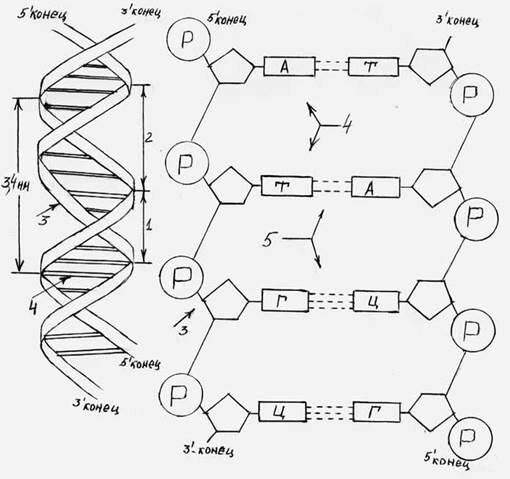 Молекула ДНК состоит из двух полинуклеотидных цепей, закрученных вправо вокруг одной и той же оси образуя двойную спираль.