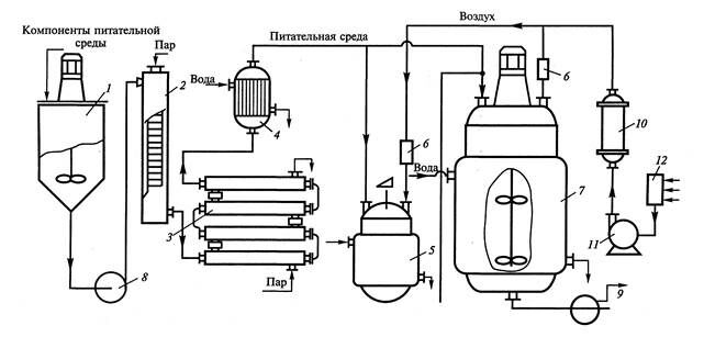 1 - смеситель питательной среды; 2 - колонка для непрерывной стерили зации потока питательной среды; 3 - теплообменник - выдерживатель; 4 - теплообменник для охлаждения потока питательной среды; 5 - инокуляторы (или посевные аппараты); 6 - индивидуальный фильтр для очистки воздуха; 7 - ферментер; 8,9 - насосы; масляный фильтр для предварительной очистки воздуха; 11 - компрессор; 12 - головной фильтр для очистки воздуха.