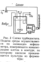 При турбидостатическом режиме культивирования постояннство концентрации клеток обеспечивается управляемым изменением скорости протока жидкости через аппарат за счет подачи больших или меньших объемов питательной среды. Наиболее распространенным методом определения концентрации клеток в культуральной жидкости является измерение светорассеивания (мутности) выходящего из ферментера потока с помощью прибора-нефелометра, измеряющего мутность жидкости по величине светорассеяния. Сам прибор посредством электрической схемы связан с насосом для подачи питательной среды или вентилем (краном), регулирующим эту подачу. Повышение концентрации клеток в культуральной жидкости, приводит к увеличению светорассеяния, что автоматически вызывает увеличение объема подаваемой в аппарат свежей питательной среды, и что, в свою очередь, приводит к вымыванию избыточных клеток. Наоборот, при уменьшении светорассеяния (снижении концентрации клеток) скорость протока жидкости через аппарат уменьшается и соответственно уменьшается процесс их вымывания из ферментера.