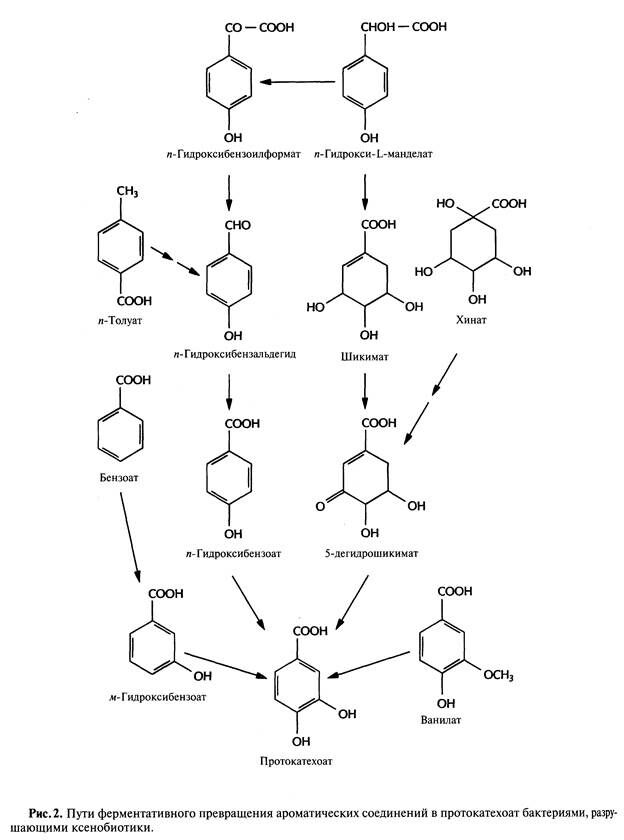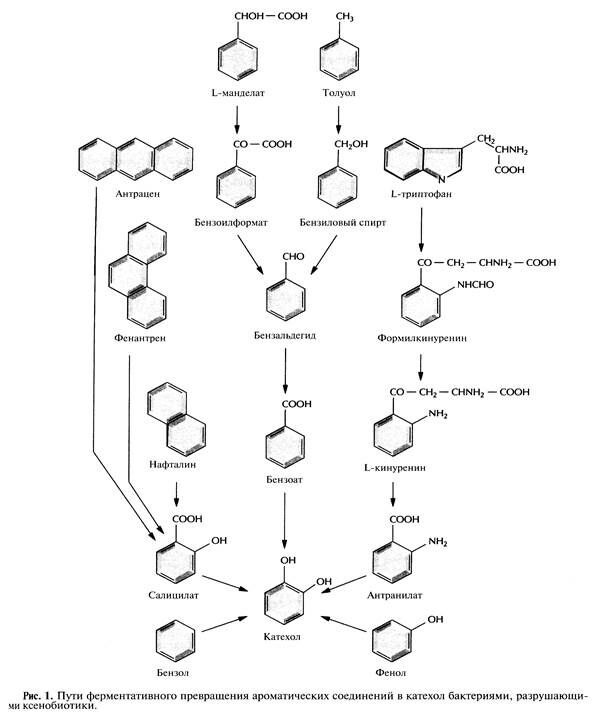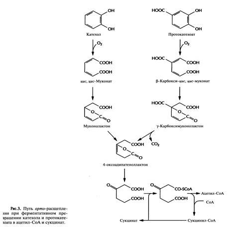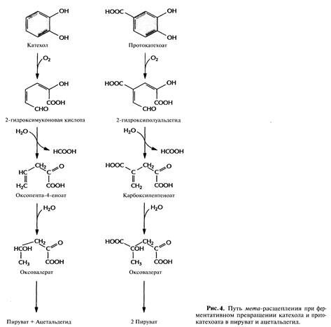 Бактерии, разрушающие негалогенированные ароматические соединения, как правило, превращают их в катехол (рис.1) или протокатехоат (рис.2), а затем, в ходе нескольких реакций окислительного расщепления, — в ацетил-Со А и сукцинат (рис.3) или пируват и ацетальдегид (рис.4). Эти последние соединения метаболизируются практически всеми микроорганизмами.