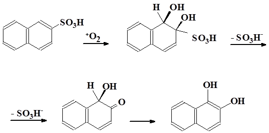 Разрушение ароматических соединений содержащих сульфогруппу (эмульгаторы, смачиватели, компоненты красителей) протекает обычно через предварительное удаление сульфогруппы, которая обеспечивает общую устойчивость молекулы к биодеградации.