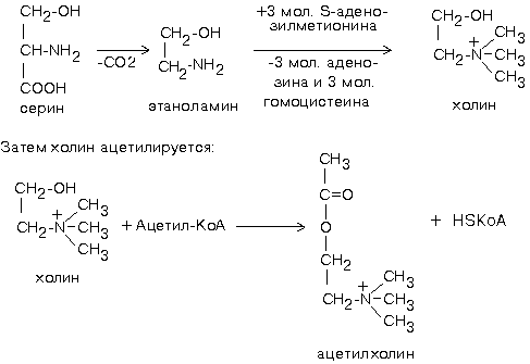 Для синтеза холина требуются аминокислоты серин, метионин. Этаноламин может быть использован и в готовом виде. Но, как правило, из крови в нервную ткань пступает уже готовый холин. Второй же предшественник этого нейромедиатора - Ацетил-КоА, синтезируется в нервных окончаниях.