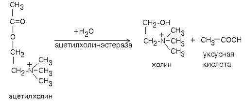 При взаимодействии с ацетилхолином белок-рецептор так изменяет свою конформацию, что внутри него формируется натриевый канал. Катионная селективость канала обеспечивается тем, что ворота канала сформированы отрицательно заряженными аминокислотами. Таким образом повышается проницаемость постсинаптической мембраны для натрия и возникает новый импульс (или сокращение мышечного волокна). Деполяризация постсинаптической мембраны выеывает диссоциацию комплекса “ацетилхолин-белок-рецептор” и ацетилхолин освобождается в синаптическую щель. Как только ацетилхолин оказывается в синаптической щели, он за 40мкс подвергается быстрому гидролизу под действием фермента ацетилхолинэстеразы: