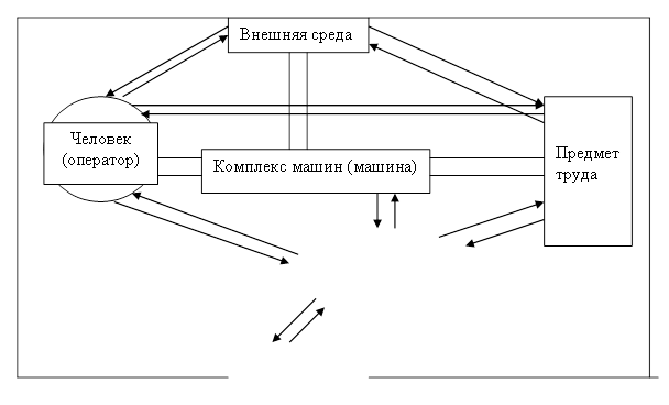 Структурная схема взаимодействия в системе  «человек-машина-предмет труда-внешняя среда» (ЧМС), с учётом внесённого дополнения,  представлена на рис. 2.1. Она включает в себя человека, машину (или комплекс машин), предмет труда, трудовой коллектив вне зоны действия машины и окружающую среду (как внешнюю, так и внутреннюю). К предметам труда, как известно, относятся обрабатываемые изделия, почва (грунты), перевозимые грузы и т. д., которые существенно влияют на интенсивность и характер возникающих при работе машин факторов, а в ряде случаев и сами могут быть их источниками. Особую группу в представленной системе ЧМС представляют лица, вовлекаемые в неё, но не связанные с управлением, использованием или обслуживанием машины. Эта группа делится на четыре ступени: машина – микроколлектив, машина – макроколлектив, машина – регион, машина – популяция, в каждой из которых наблюдается своя специфика взаимоотношений, связей и задач.