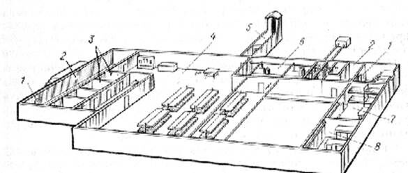 1 - защитно-герметические двери; 2 - шлюзовые камеры; 3 - санитарные узлы; 4 - основное помещение для размещения людей; 5 - галерея и оголовок аварийного выхода; 6 - фильтровентиляционная камера; 7 - медицинская комната; 8 - кладовые для продуктов.