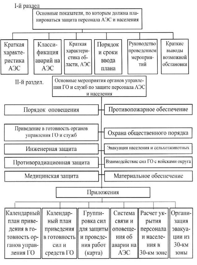План мероприятий определяет организацию и порядок выполнения таких мероприятий по защите персонала и населения в случае аварии на АЭС. Он должен состоять из текстовой части и приложений.