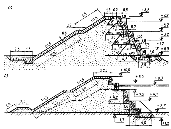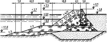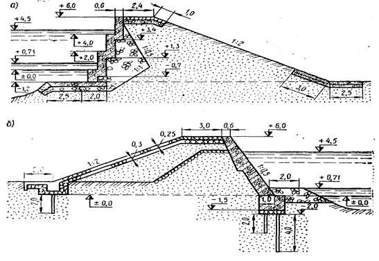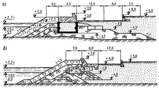 Такие берегозащитные стены возводятся обычно с целью защиты расположенных на берегу объектов от наводнений, в первую очередь от ураганов. Основным конструктивным элементом сооружения, показанного на рис. 4.13, а, является небольшой по высоте массив-гигант, заполненный песком и имеющий тяжелую надстройку. В сооружении, представленном на рис. 4.13, б, роль основных конструктивных элементов выполняют бетонируемые на месте бетонные и железобетонные большеразмерные блоки. Впереди устроены откосные части сооружений в виде каменных набросок, покрытых двумя слоями тетраподов массой по 12,5 т. Между парапетами сооружения и расположенными в глубине берега подпорными стенами находятся водоотводные зоны (каналы) шириной 20 м. С тыльной стороны подпорных стен используемая территория берега поднята до отметки +5,0 м. Как показали опытные исследования на моделях этих сооружений, волны высотой 5 м и периодом 9 с разрушаются на откосах, а волны с большими высотой и периодом — в створах ближе к основанию откосов.