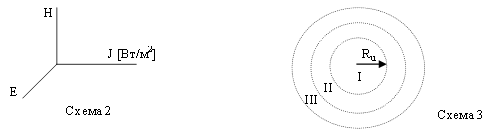 В схеме 3 - I) - зона индукции (ЭМ поле еще не сформировалось, электрич. и магнитное поля действуют отдельно); II) - переходная между I и III зонами; III) - зона излучения (волновая зона - где ЭМ поле сформировано). Радиус зоны индукции зависит от длины волны излучения: