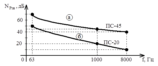 Шумовые колебания обладают свойством накопления в организме (кумулятивности). Вредность шума как фактора производственной среды приводит к необходимости ограничивать его уровень. Для профилактики и уменьшения вредного воздействия шума необходимо соблюдать гигиенические нормативы. В основу этих норм положены ограничения уровня звукового давления в пределах октавных полос всего спектра шума с учетом характера шума и особенностей трудовой деятельности. Совокупность октавных полос называется предельным спектром (ПС;рисунок 2.2), который показан для радиовещательной студии (б) и конструкторского бюро (а).
