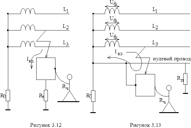 В электроустановках напряжением до 1 кВ при использовании трех проводных сетей с заземленной нейтралью защитное заземление не обеспечивает защиты людей от поражения электрическим током (рисунок 3.12).