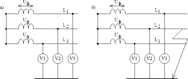 а) при неисправном состоянии изоляции показания всех вольтметров одинаковы и равны фазному напряжению: