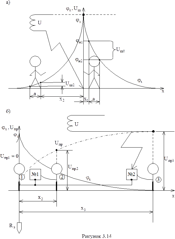пойдет через тело человека, что может привести к его поражению (рисунок 3.10,б). Для уменьшения напряжения на заземлителе, сопротивление защитного заземления