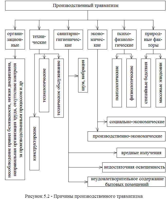 Одной из основ принятия управленческих решений является анализ причин производственного травматизма (рисунок 5.2). Травмы на производстве следует отличать от других травм (бытовых, непроизводственных трудовых увечий). Порядок их расследования, оформления, назначения и выплаты пособий по временной нетрудоспособности различен. При несчастном случае на производстве компенсация потери трудоспособности по временной нетрудоспособности осуществляется с первого дня в полном объеме.