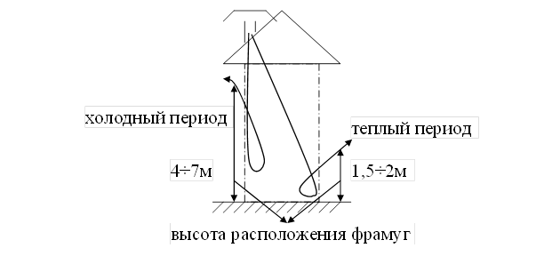 где H – высота вытяжных проемов, Δt – коэффициент, учитывающий повышения температуры с высотой (Δt= 0,5÷1,5град/м), tпр – температура подаваемого воздуха, которая чтобы не вызвать переохлаждения работников должна быть на 5÷7 градусов ниже tрз