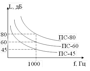 нормируется по предельным спектрам (ПС) – это зависимость предельно допустимых уровней звукового давления от частоты