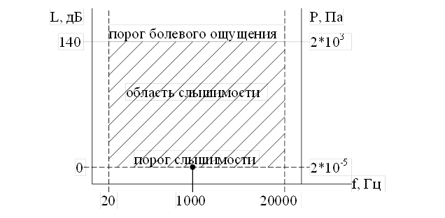 где P – мгновенное значение звукового давления, P0 – стандартное звукового давления на пороге слышимости при частоте 1000 Гц (P0=2*10-5Па – международный стандарт)